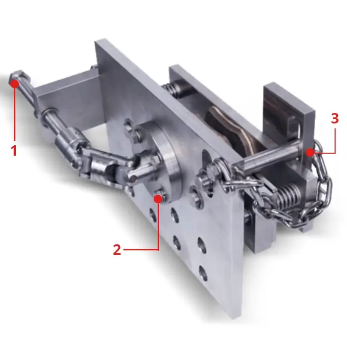 - Bloqueo físico: incluye un pasador de bloqueo transversal (Cross-pin locking) que garantiza un bloqueo mecánico total durante las labores de mantenimiento.