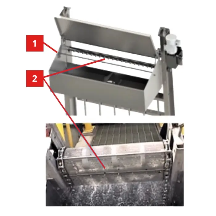 Sistema autolimpiante de cinta giratoria. Elimina los residuos automáticamente mediante chorros de agua internos, garantizando un flujo constante sin intervención manual.